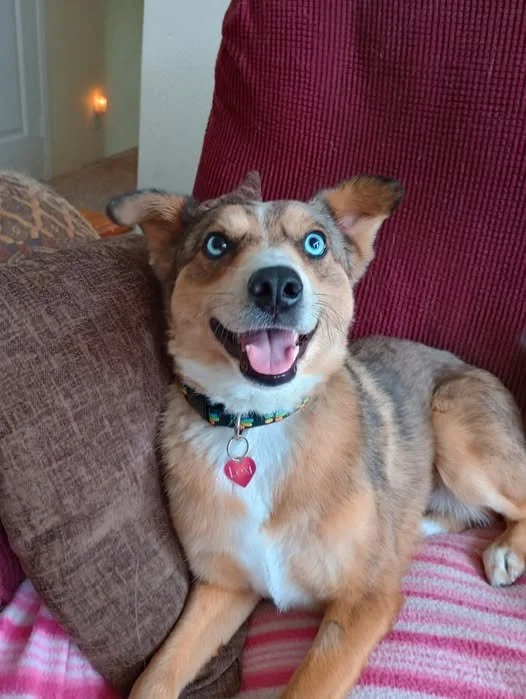 The vet says Lexi is an Aussie mix. People who've met her say she's all Aussie in personality. She is petite (30 pounds), 2-3 years old, spayed, fully housetrained and knows all of her commands. She has beautiful eyes! One blue, one half blue half brown.